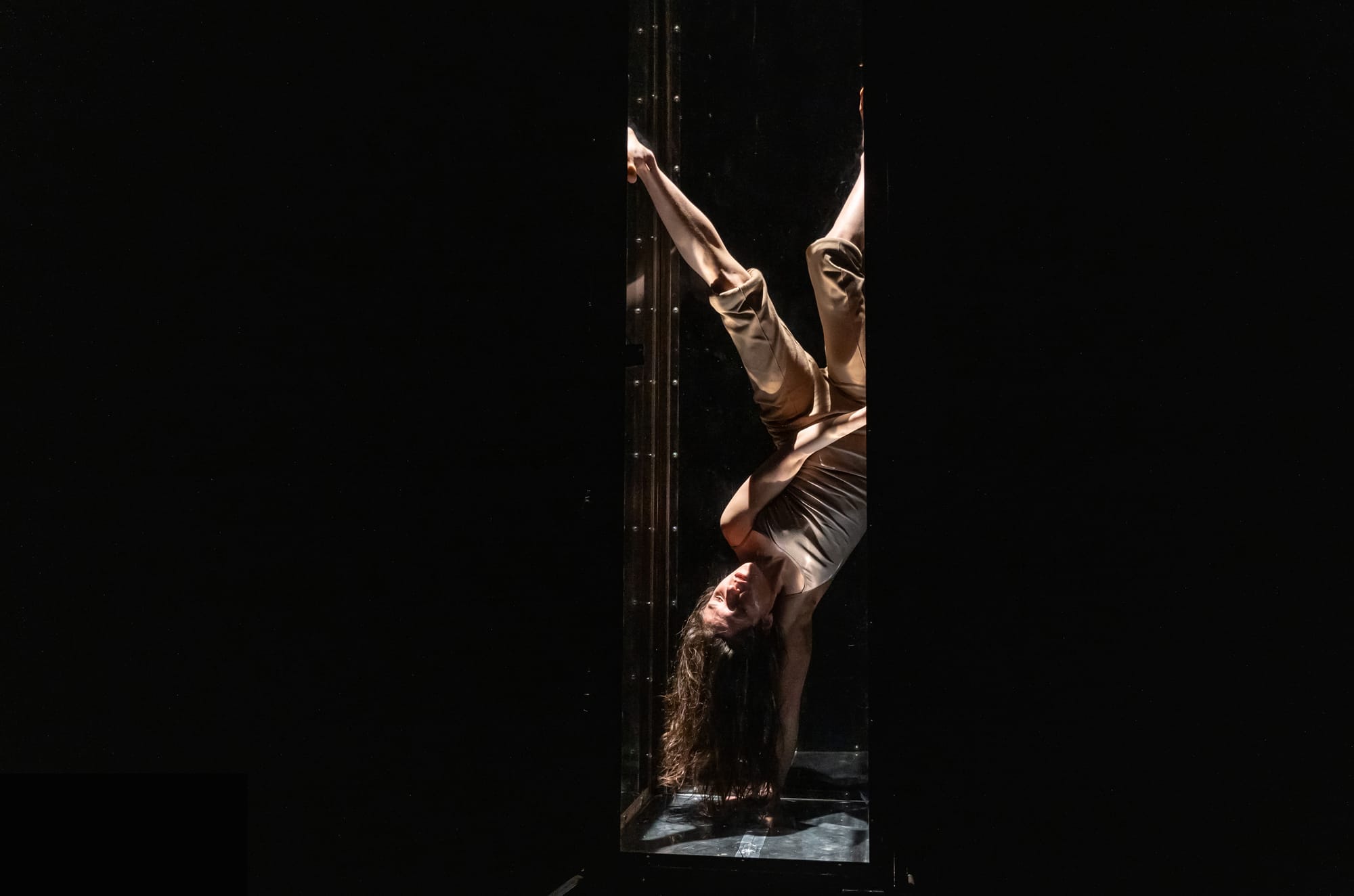 AR: The plexiglass box appeared in 2018 while working with the circus director Roberto Magro in his show, Silenzio. He asked me to produce an aerial rope act in a suspended transparent cage as if escaping from it. The inside of the structure was very narrow to do rope tricks in and using this apparatus in an already suspended environment was challenging. I began naturally to keep the walls still so they didn’t move. I started to develop my circus idea within it, taking cues from Chinese pole technique and handstands, which I transposed to my suspended situation. From the aerial disciplines, I took the dynamics of pulling and looking for falls. With these movements, we noticed that the rope was not necessary anymore, and we both enjoyed the result. It was just one specific moment of the show, less than three minutes long, but that’s the spark of how my journey with a plexiglass cage began.