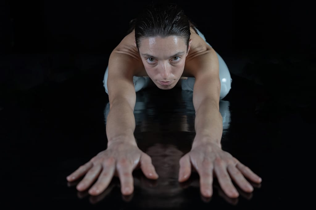 Andrea: We needed a surface on the ground to let the body oil run on, and we found the solution in the linoleum strip. On it, we noticed that we were moving in a straight line, and our body positions became naturally opposite, one in front of the other. We then researched removing any acrobatics in favour of postures you can assume in everyday life, even if you are not a circus artist. From these basic positions, like standing or being on our knees, we started to work on finding unusual ways of moving and creating displacements, working on precision in a non-precise medium.