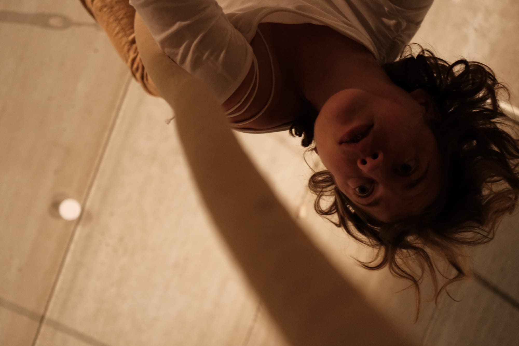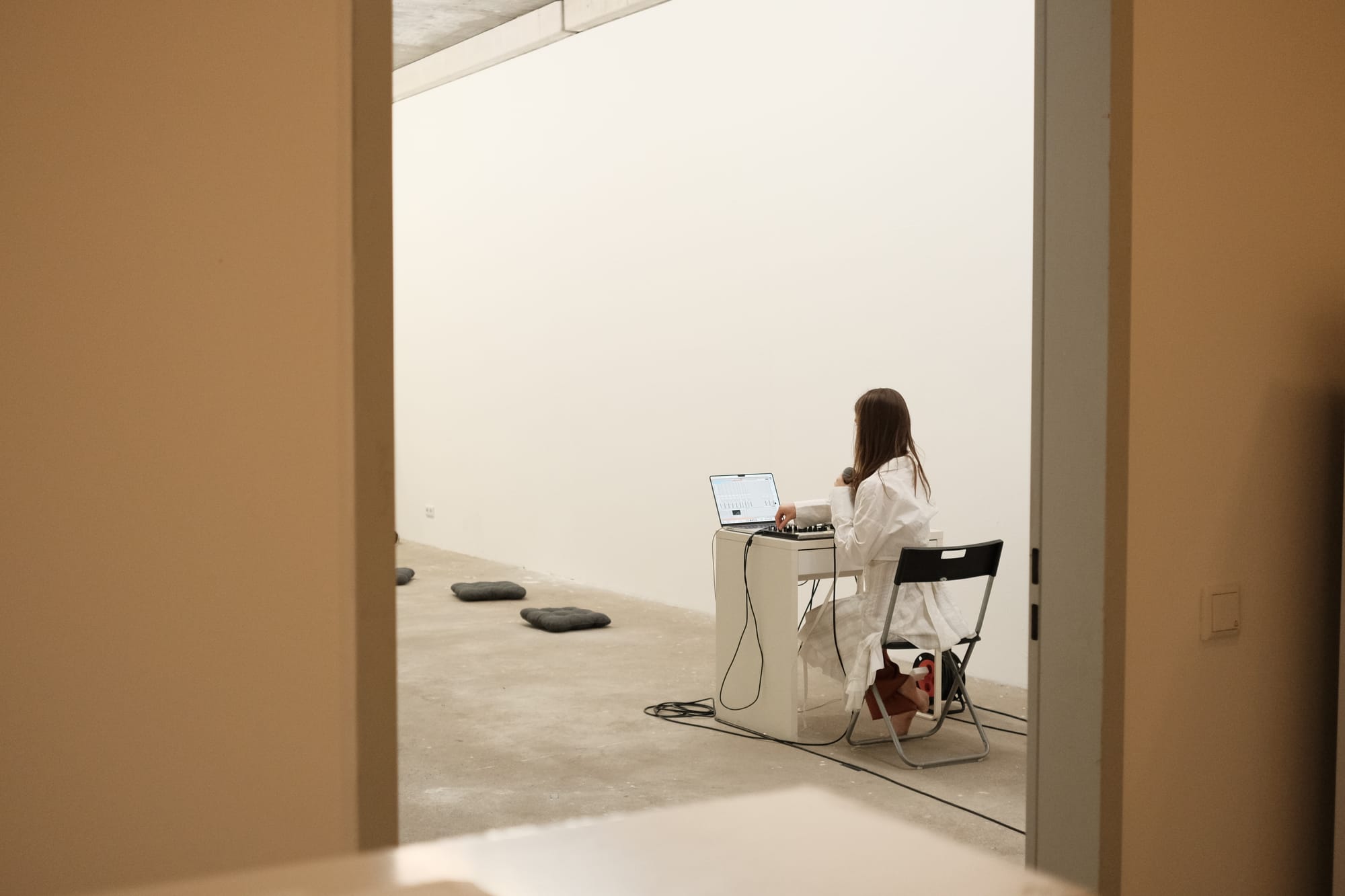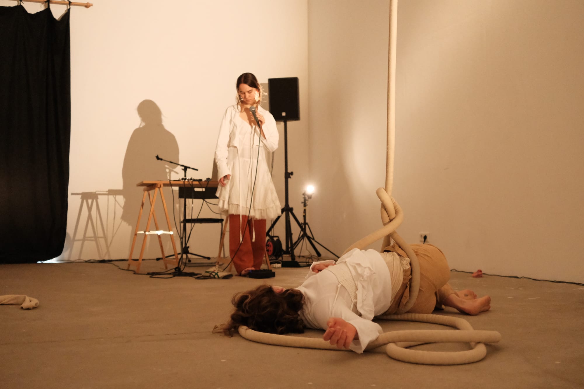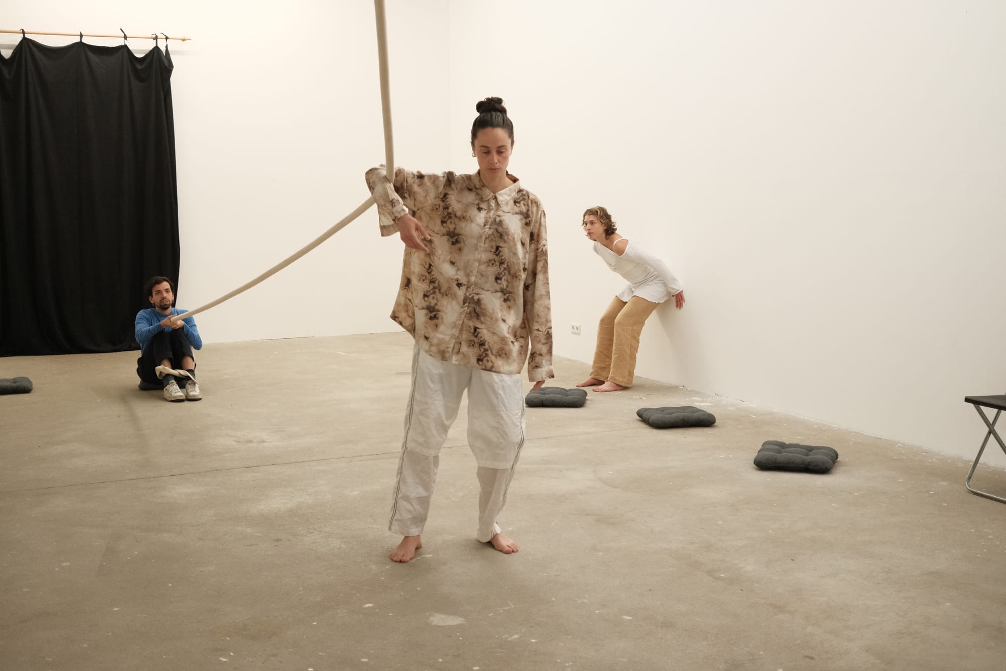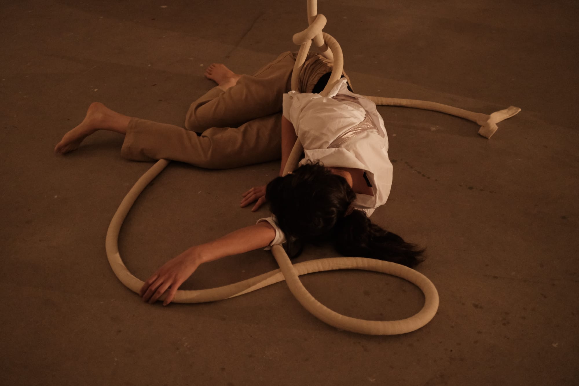 Beneath the pillow on which I rest, I feel the hard, cool floor of the white cube. A warm, muted light falls on three bodies suspended from ropes attached to the four-meter-high ceiling, their limbs tightly entwined. The door closes softly behind those entering, who search for their place until they, too, touch the ground. At the edge of the room, in front of the console and the speakers, a fourth person raises her voice. Through the microphone, it multiplies, layering itself again and again, until a polyphonic weave emerges. It hovers between the celestial and the earthly, like a distant yet familiar funeral chant, and envelops the room in a fragile gravity. As the voices circle and fade, the three rope-bodies begin to uncoil — tentatively, cautiously, sometimes weightless, sometimes drawn down by heaviness. Their descent takes time, until at last they reach the ground and remain there, still and motionless. After a few moments of silence, the first person slowly rises and opens the door to the exit until the last visitor has left the room. The door closes—only to reopen for the next group of visitors, already waiting impatiently.
