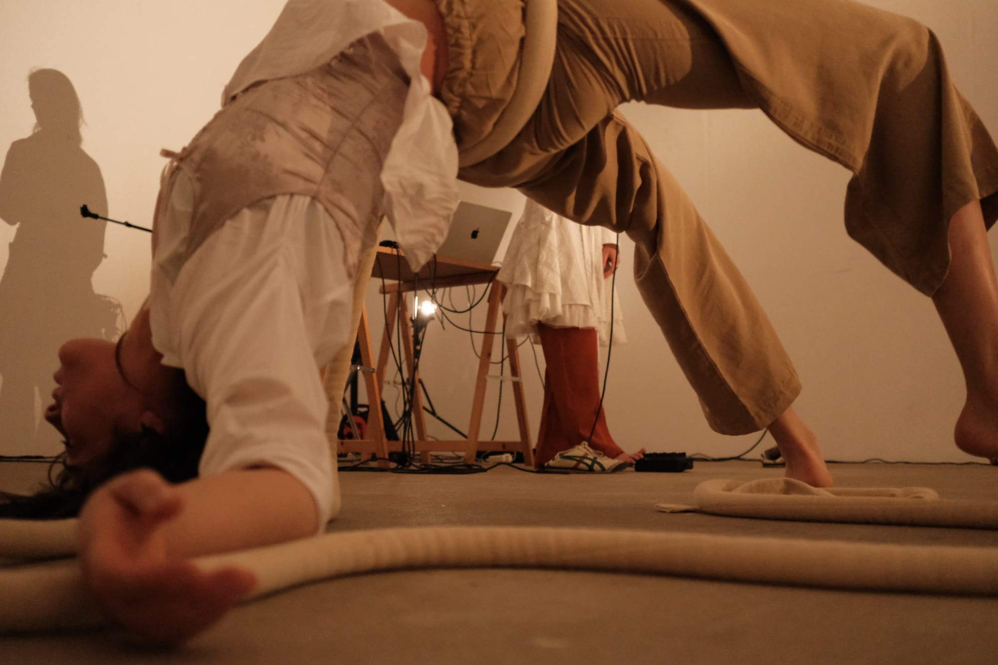 During one performance, a rope was stretched across the room. One person held it at the end, while another weighted it with their body, making the act of holding physically demanding. As soon as the person holding the rope reached their limit, someone stepped in to relieve or support them. This generated a sense of community that was not staged, but truly experienced.