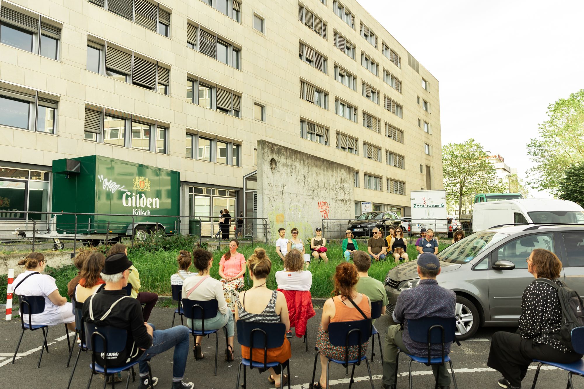 Our bodies interrupt the urban rhythm of this quiet neighbourhood. Someone chooses to join us and asks for a chair. They don’t see the point, so they leave again. Someone else uses their own terrace chair to sit and stare back at us. The act of looking back is more provocative than asking questions or trying to speak to the sitting people.