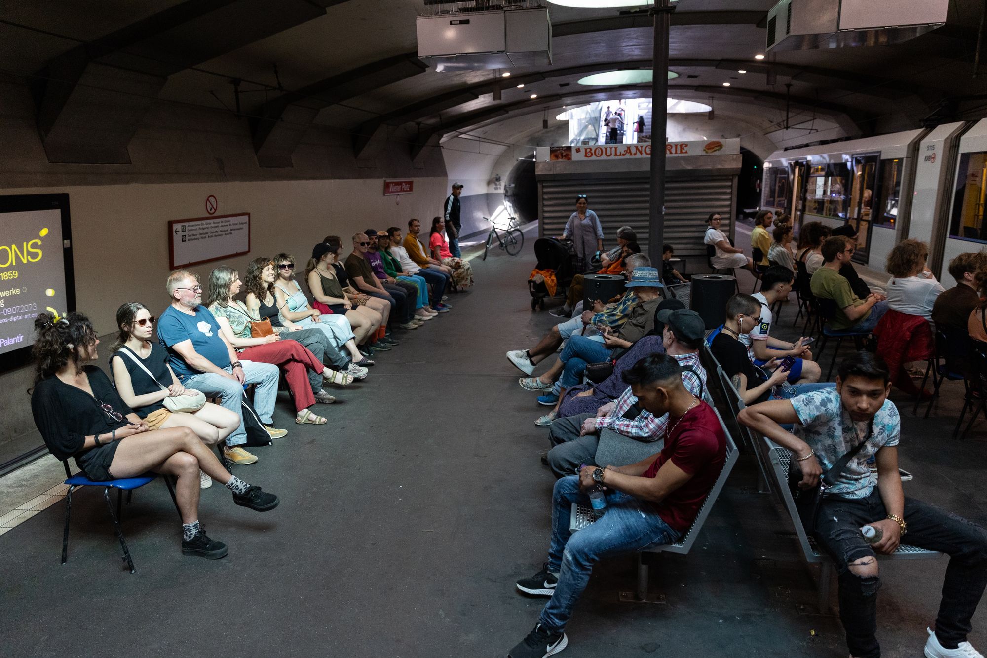 The second part of the performance takes the audience out on the streets of Cologne. We’re invited to carry our own chairs, and divided into two groups, we follow a group leader. The absurd humour to which we were introduced in the first part of the performance sets the tone for this itinerant element of the experience. The two groups follow a pre-set route in the city; walking is alternated with sitting. We are instantly transformed from audience to performers on view for the city’s passers-by.