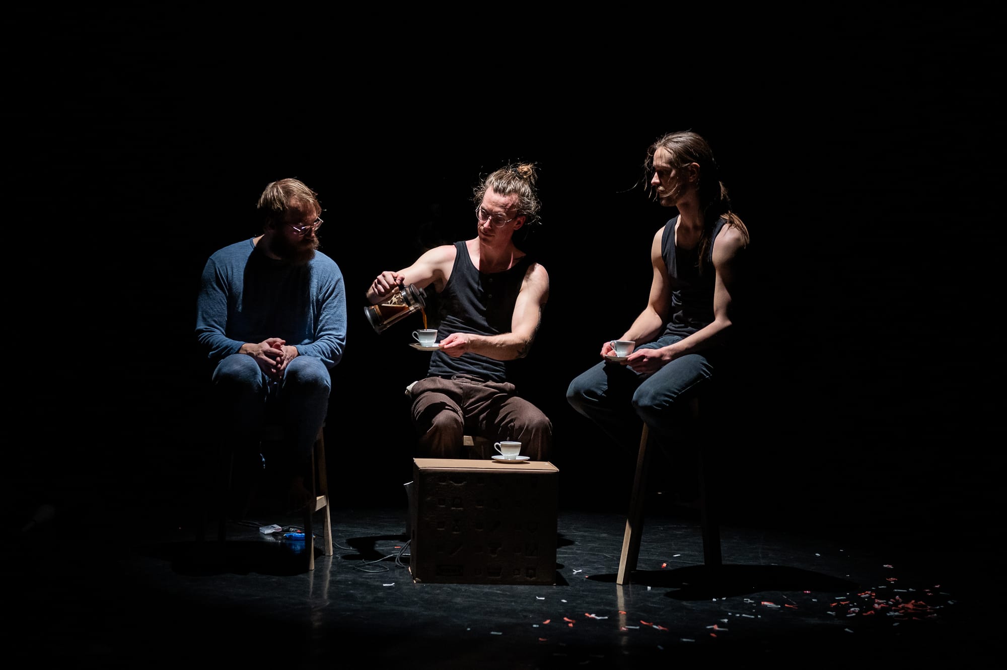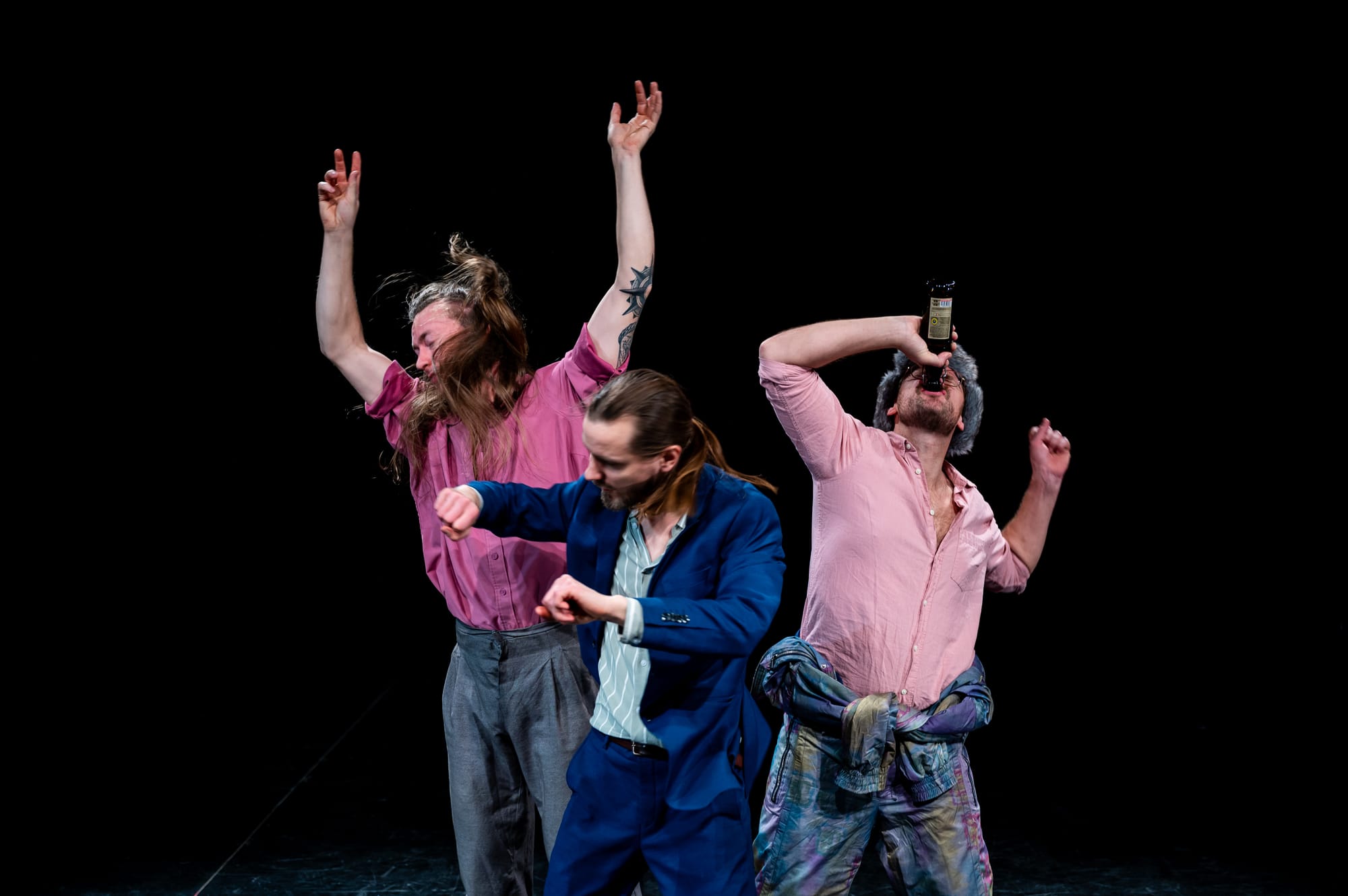 where It is a continuation in how use a personal standpoint in the creation, but we had more of an urge to make it more abstract and more multifaceted; leave more space for the absurd in it. Then it slowly chiselled into a more narrowed-down perspective. We ended up being a bit more autobiographical and closer to home than expected. But of course, this is partly why we make shows about Nordic identities and Nordic culture, in this case, drinking—we can only make art about what we can actually talk about; this gives us confidence in the material. And we are men from the North, who occasionally drink, so we’re exploring that. We’re not trying to present a final, exhaustive version of Nordic identity. We are showing our shared collective experiences and they are specific enough to be relatable to Nordic people, but also broad enough that other people can recognize.