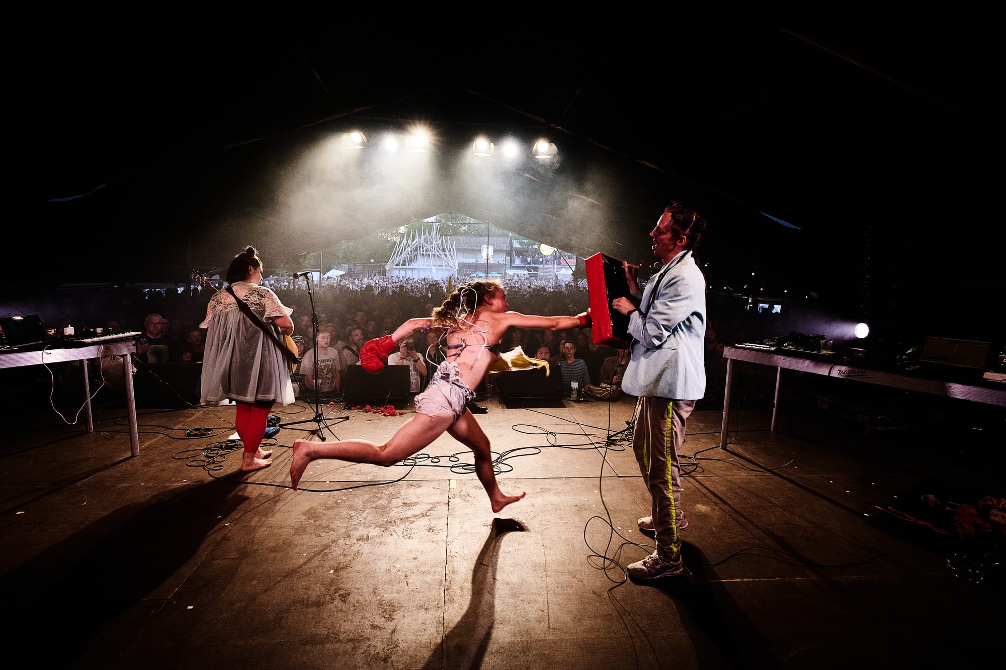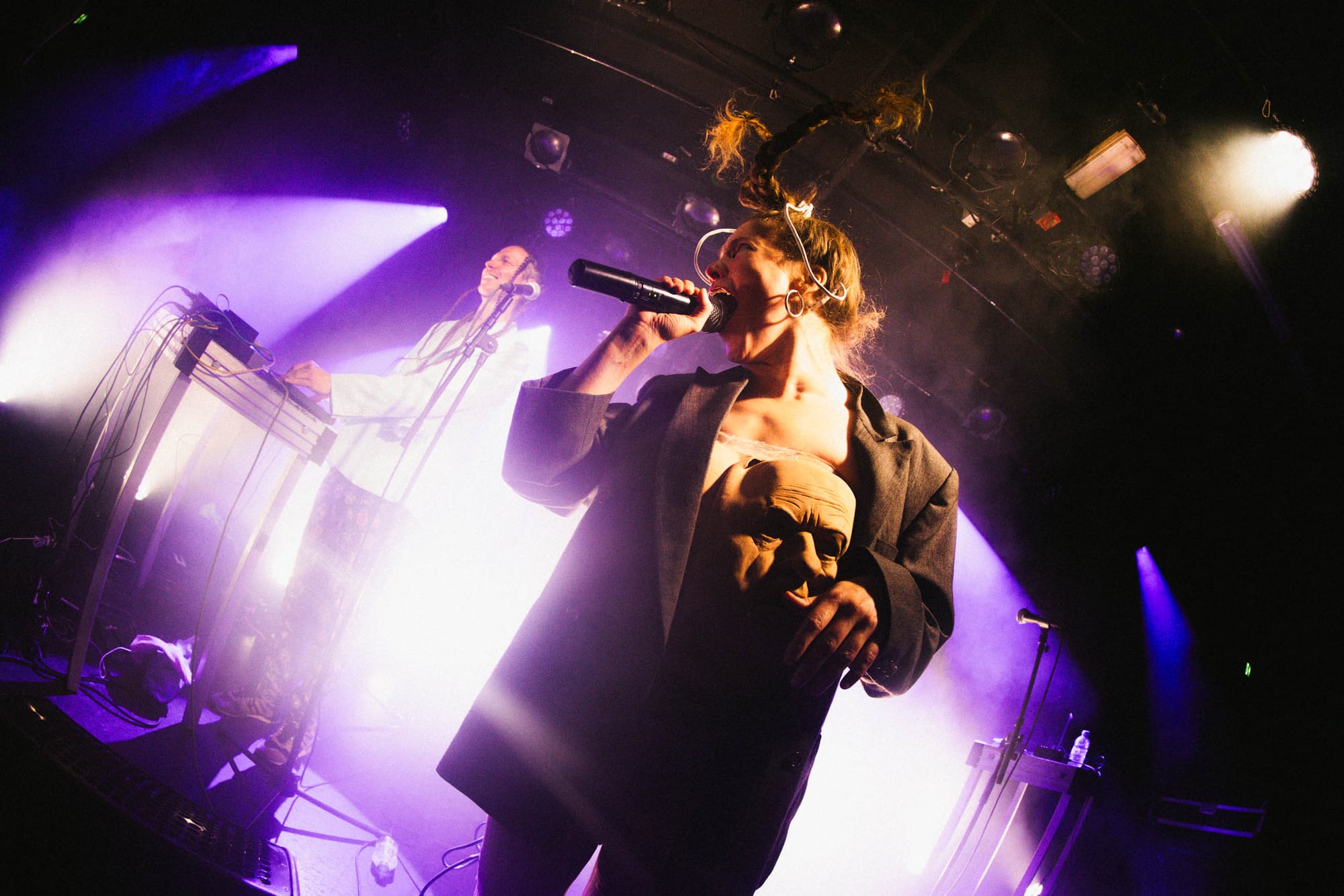 The show started softly and plushly. Pink dress, shirt, jacket, ponytail, a guy with a hat behind a synthesiser. They entered the stage and greeted the audience with a cute, almost shy ‘Good evening’ and ‘Thank you for inviting us’. An innocent smile on their faces; for the first minute, everything was normal. Niklas is behind the synth, Heidi is playing the bass, and Milla is holding the microphone. What a nice trio, I thought to myself: this is going to be a pleasant performance to end the festival; I am curious to see how they will combine all of these musical genres.