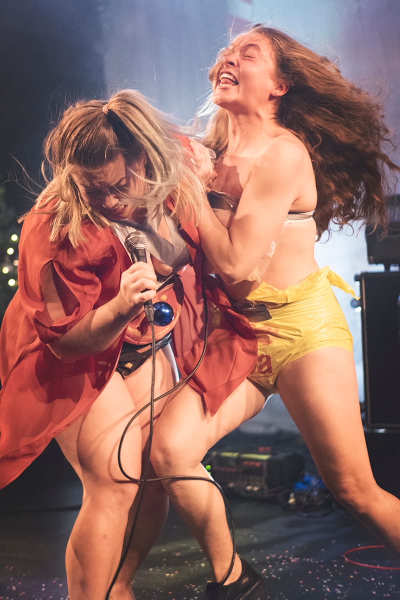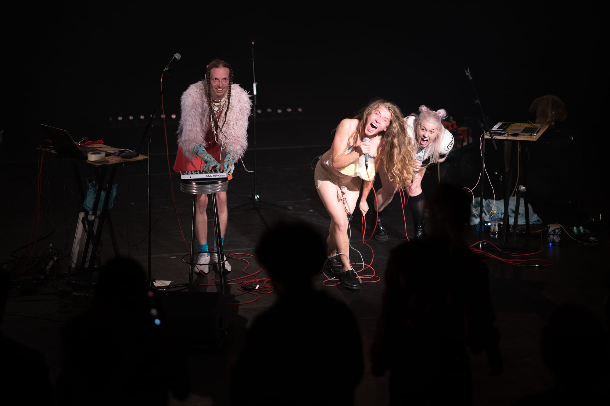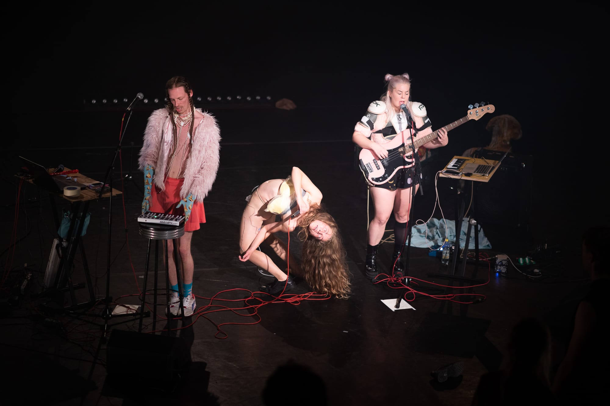 The Muovipussi trio is a rare experience. The name in Finnish means plastic bag. Inside that plastic bag, you will find firecrackers with instruments. Sometimes on stage, their outfit involves plastic bags; sometimes it doesn’t. Their aesthetics go hand in hand with their music and performance, and their mantra seems to be: let’s play with all of it. Their appearance was the first thing I noticed before the performance began. All three of them looked like teenagers who simultaneously enjoy girly pop and death metal music. But each of them had their own aesthetic expression. These three strong and different personalities have known each other since high school, and their intimacy is the fruit of years of bonding. This confidence in allowing themselves to push their own physical limits is palpable on stage, where they playfully seem to push each other through complicity and humour.