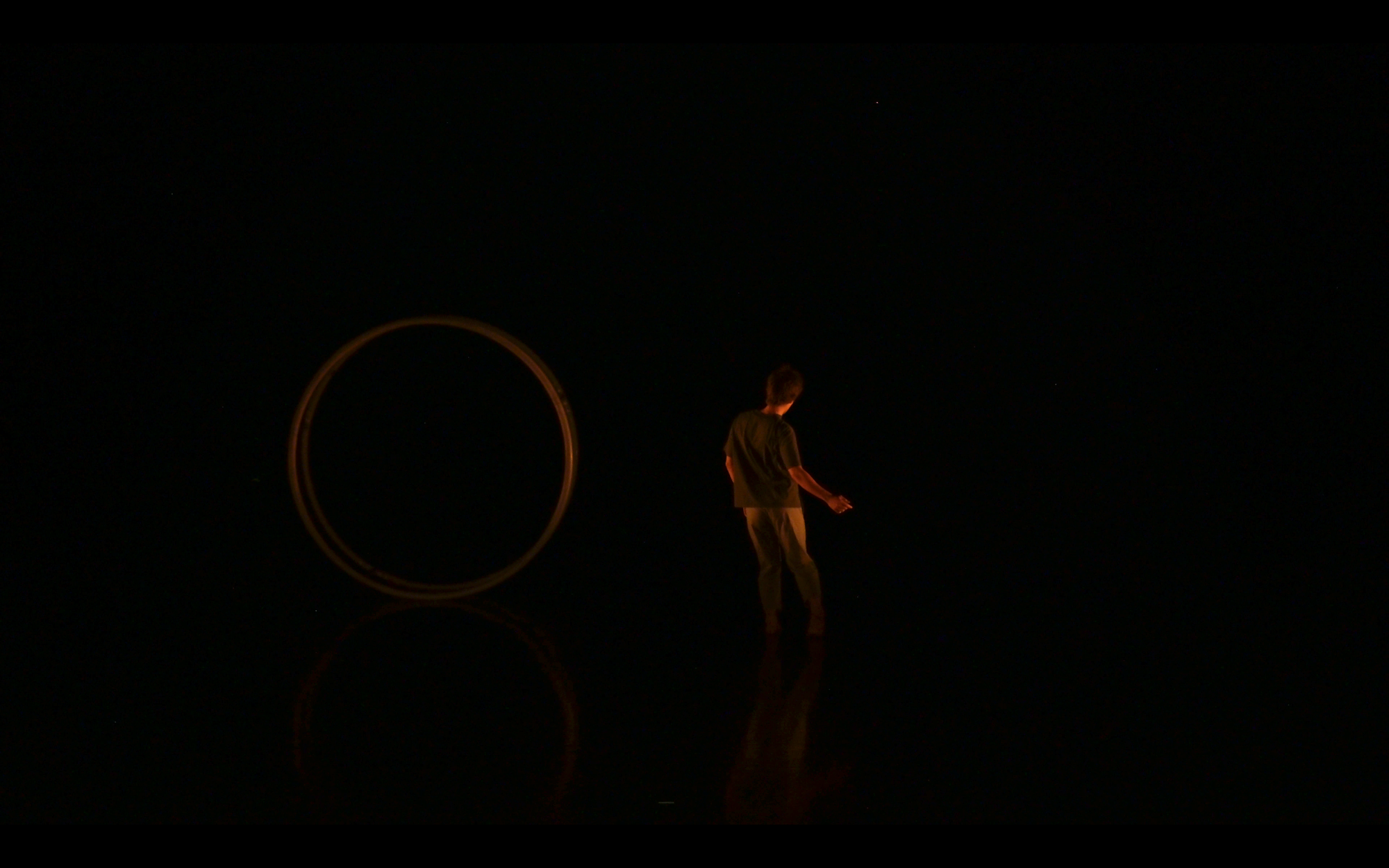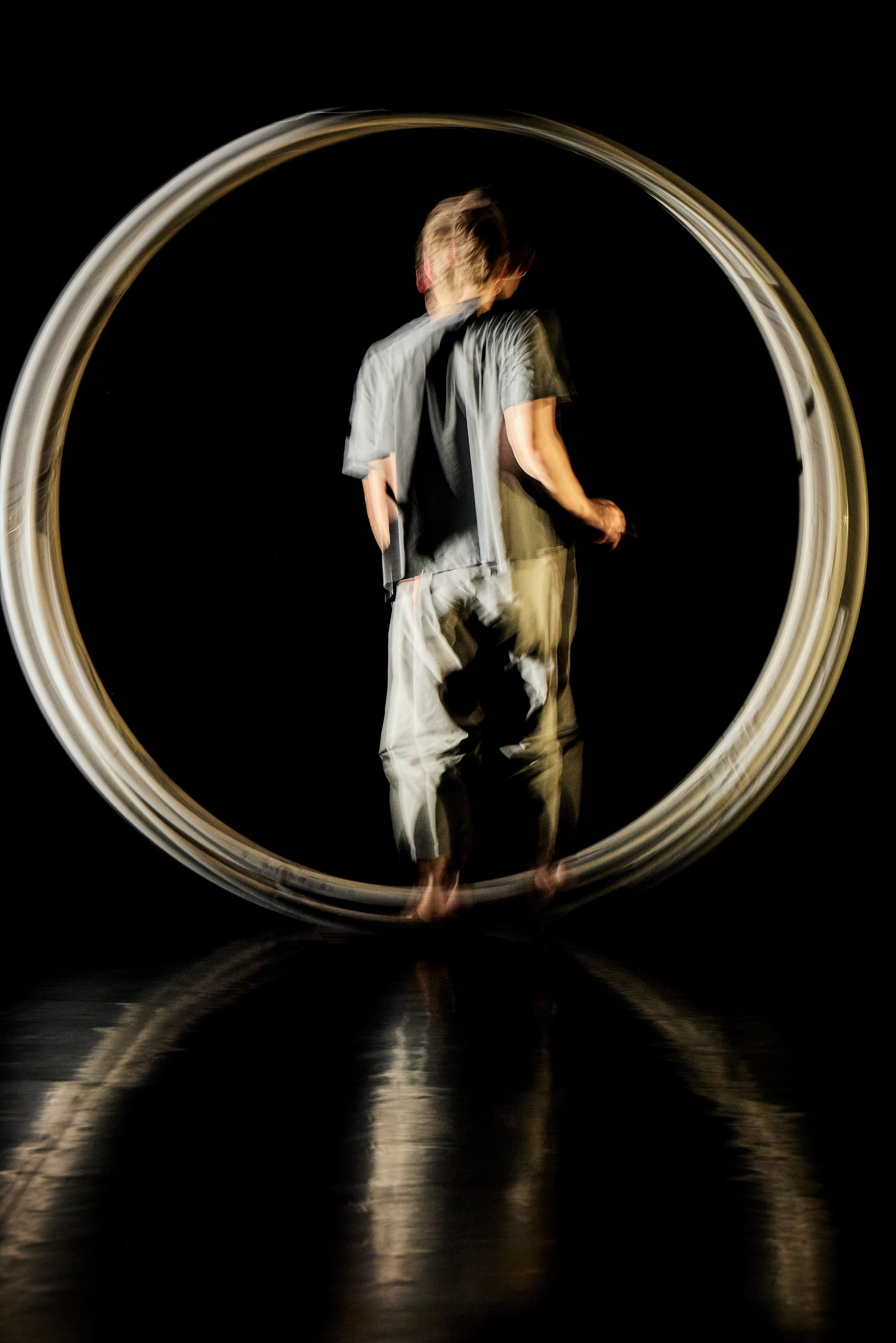 Noa Aubry is a French circus author interested in pushing forward the technique of the German wheel. Studying circus since she was an adolescent and then at a professional level at CNAC, she ended the trajectory of the circusnext process presenting a powerful and delicate solo with a long provocative French title, Là où la nuit n’est pas si loin puisque le jour s’en va deja. Noa’s personality finds her expression in the constantly shifting limits, where space and time coordinates meet each other and balance a dance of interlinked contrasts. Her technique of listening to the apparatus as it reacts to her movements redefines the mastery of controlling the object. In her solo, the German wheel becomes a space of being, a 360 bubble in motion responsive to weight control. For this article in the circusnext interviews series, we move at the intersection of reflective thoughts and embodied practices, looking at how she is shaping a personal artistic way of using an uncommon circus apparatus from gymnastics.