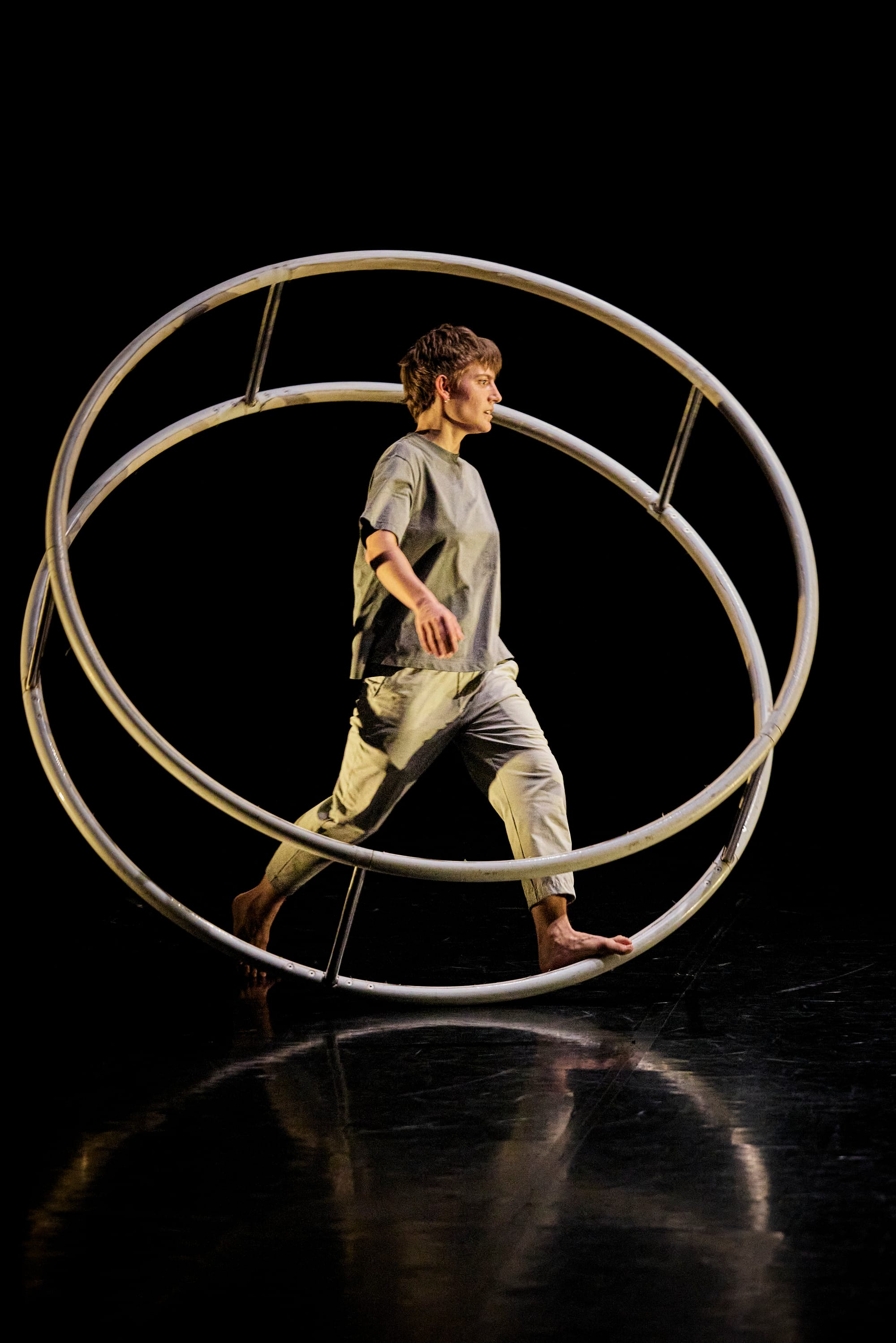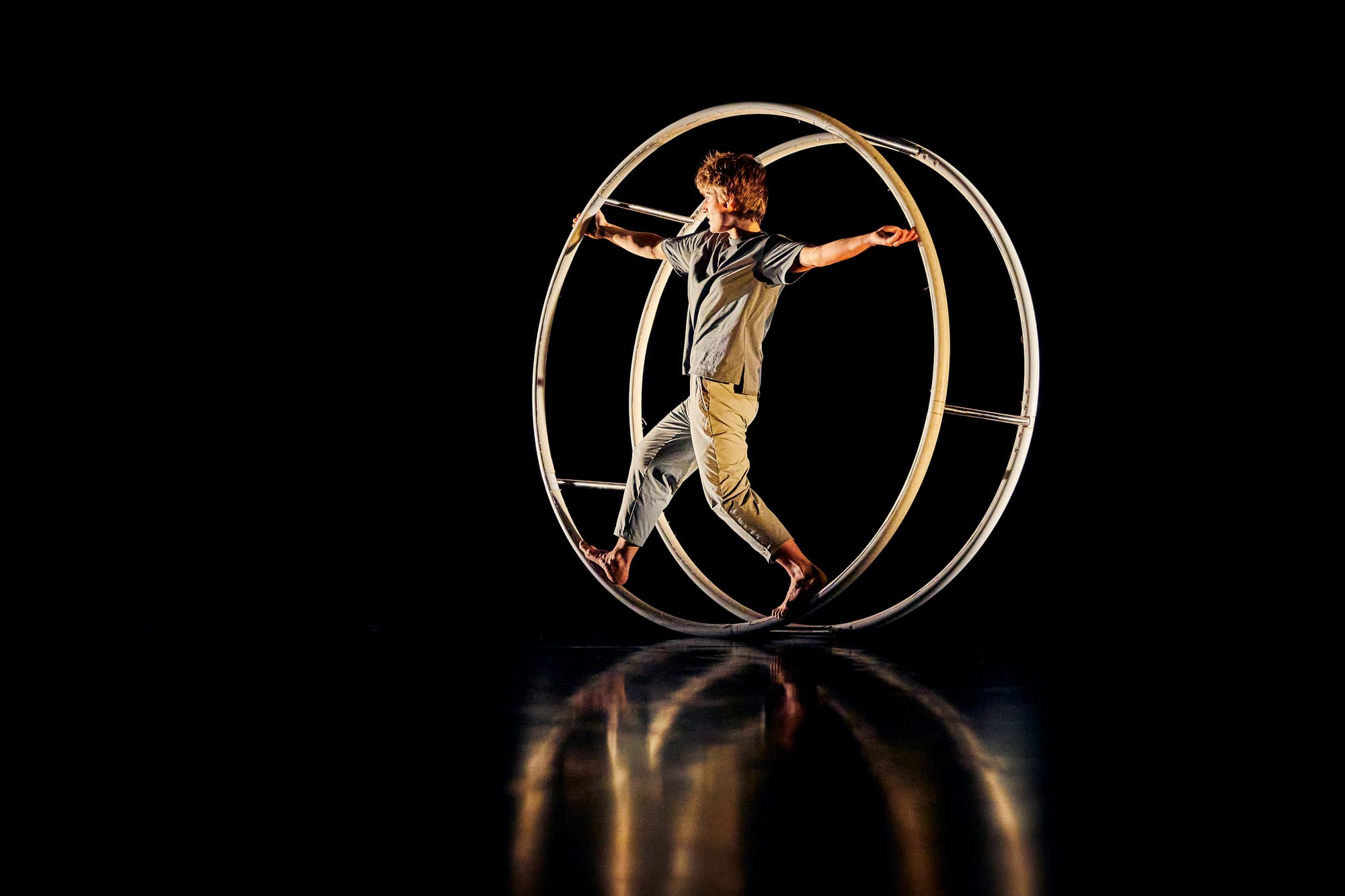 Since the beginning of the creation, and even before, there’s been an emphasis on the quality of touch. The feet, for example, how the feet land on the wheel, how they land on the ground. Working on twists, which are more dance-related work, understanding what the body can explore internally. What’s always complicated is asking myself: should I keep saying it’s circus? And that circus can also be this? Or should I say it is circus and dance? For me, these are infinite and very rich questions. Do we expand the category or say they are two different categories?