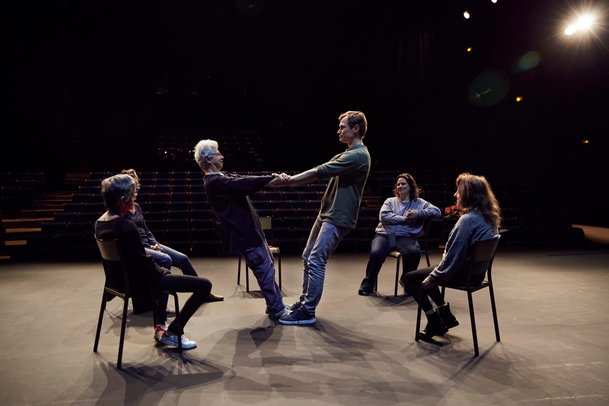 In French, Porter is similar to prendre en charge. In that sense, taking charge of older people meant developing a relationship of trust. With his ongoing artistic research, Projet Grand-Mère, Alexandre has visited hospices, hospitals and pension houses by practising hand-to-hand techniques that treated firstly the hosts as subjects. He designed acrobatic workshops as artistic research projects rather than pedagogical intents. And in using this angle, he wanted to strengthen the sense of responsibility of his older fliers instead of objectifying them.“From being considered an object of care, grandmothers became the subject of a partnership. Visual and auditive contact is fundamental to give them trust. To be seen, heard, and touched are the principles of the dramaturgy we use on stage, and are the base for an encounter, preparing them to let themselves fall, to be caught.”