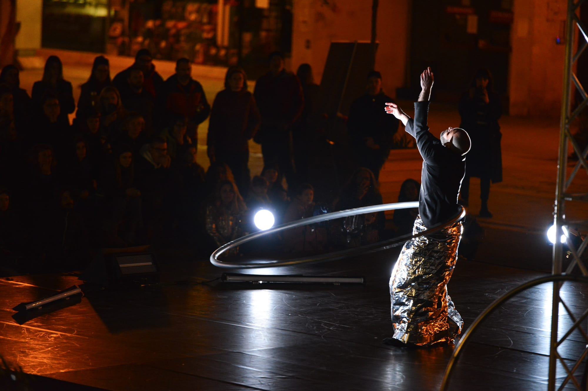 Juan Ignacio Tula’s nonchalance in approaching the stage before his performance gives an informal feeling, as if a rehearsal is about to begin. However, when he quickly catches the thread, his character suddenly appears on stage, drawing us into an unknown dimension. He begins to spin inside his large aluminium wheel, supporting its weight with the strength of his muscles. Moving but standing, the initial establishment of rhythm influences his gaze. Given the spin where he is caught, his eyes cannot communicate precisely with the outside world. Instead, the face of a lost man opens up towards us, searching for his place under the dark evening grey-blue sky, and his eyes raise upward, suggesting a search for the Almighty. The impression is immediately effective, the massive metal wheel loses its weight in a glimpse, and we are drawn into this endless game.