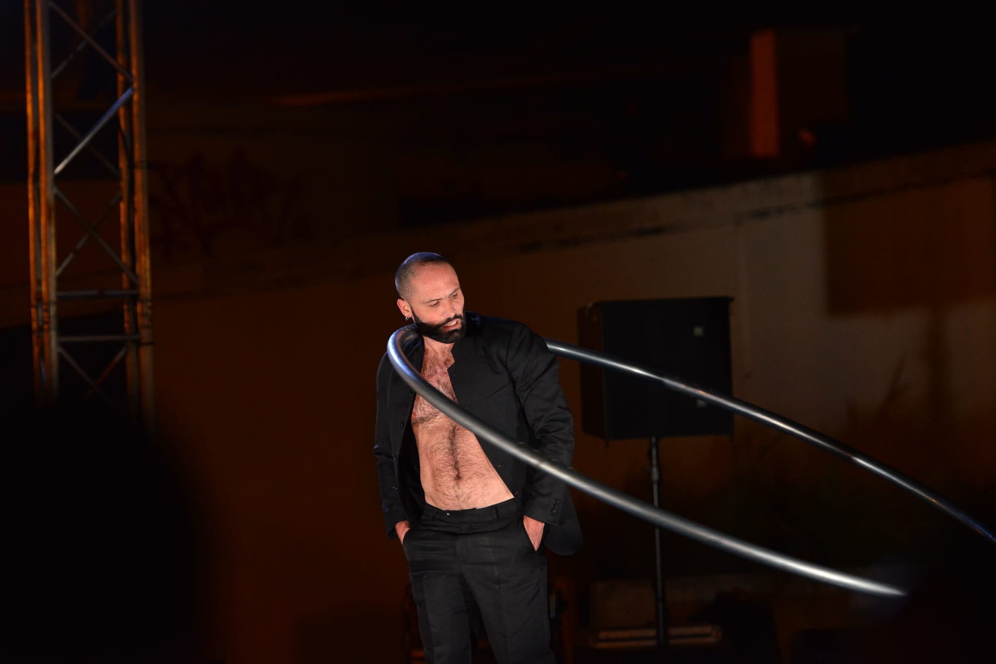 The first performance, Lontano, is performed by Marica Marinoni, an Italian artist specialising in cyr wheel who received her circus education at the prestigious French CNAC. From the first moment, it is clear that the central theme is combat. The artist appears and, entering into calm preparation, slowly puts on boxing gloves and gets straight into fighting mode. I am witnessing another incredible feat of technical virtuosity that paradoxically places the circus artist far from the usual notion of an invincible superhero mastering an apparatus. In Lontano, the image of the untouchable circus superwoman goes further into history, and it is very exciting to witness in real time such radical changes currently taking place in this artistic discipline.
