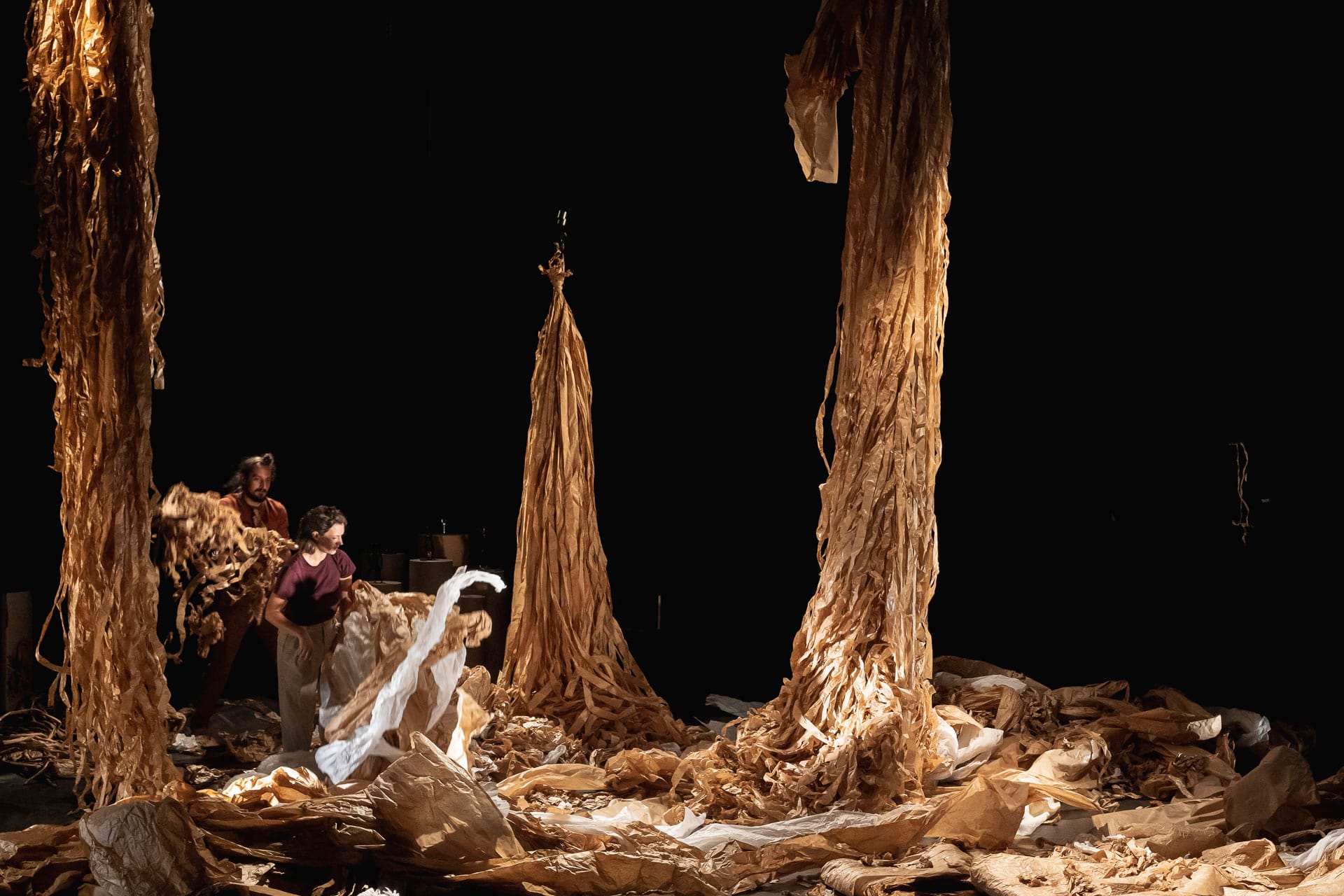 Careful though. Let’s correct something. Paper is not only manipulated by Inbal, but it manipulates her back. It is essential to note that for each performance the paper used cannot be the same. After each representation, the paper, which is now in shreds, is recycled and reused later. This means that the paper universe on stage is constructed each time for each occasion, leaving it susceptible to temperature and humidity conditions in the room. As it is twisted and folded every time, the team and Inbal need to be very attentive and listen to it, and its state, as it can break at any time when Inbal climbs it, hangs onto it, dances with it or fights it.